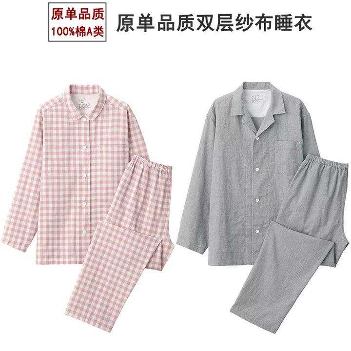 原单品质睡衣女双层纱布纯棉长袖春秋夏薄款男情侣格子家居服