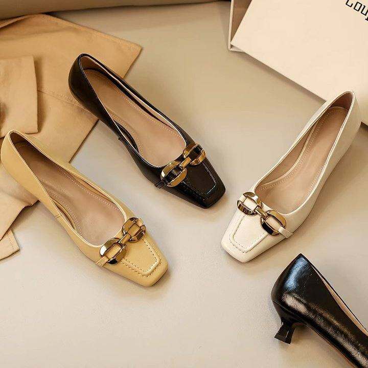 3公分小跟鞋女2023春新款金属扣低跟白色高跟鞋法式方头猫跟单鞋