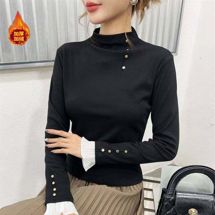 2025秋冬新款半高领加绒打底衫女t时尚花边袖保暖上衣修身显瘦T恤