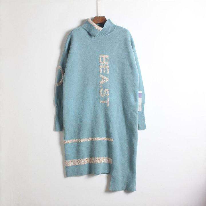 100%羊毛秋冬款小厚保暖不规则造型塌肩长袖针织连衣裙69078(瑕)
