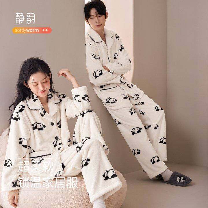 静韵【超柔软】熊猫趴趴珊瑚绒睡衣女秋冬季新款情侣家居服套装男