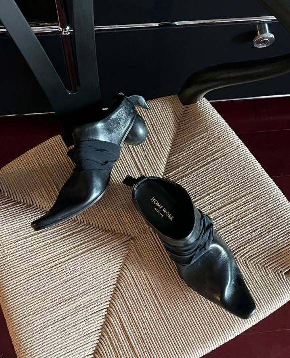 HOME WORK原创设计师简洁牛皮手工褶皱鞋面球型木跟穆勒鞋