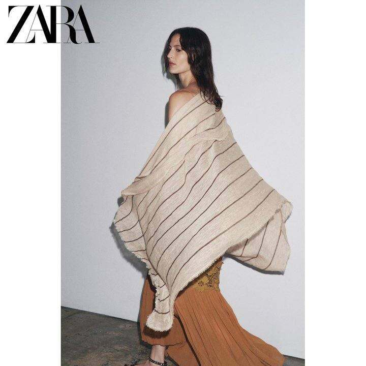 ZARA2025夏季新品 女装 条纹亚麻撞色拼接薄围巾 1023208 711