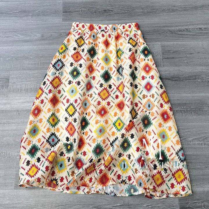 复古民族风天丝混纺松紧高腰显瘦宽松A字印花半身裙中长度假伞裙