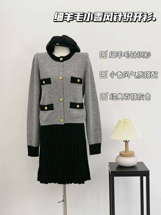 SUGAR糖糖细羊毛小香风针织开衫女2023秋新款气质灰色毛衣外套