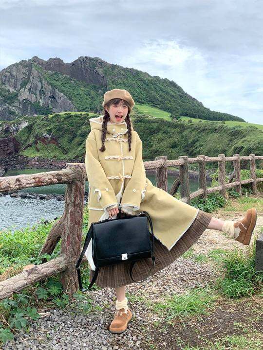 霍里德地图黄棕色连帽牛角扣皮毛一体皮草外套冬季中长款外套大衣
