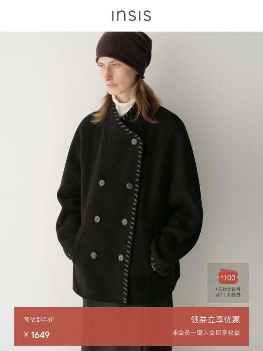 INSIS FEMME羊绒羊毛双面立绒游牧皮袢包边双排扣短款大衣外套