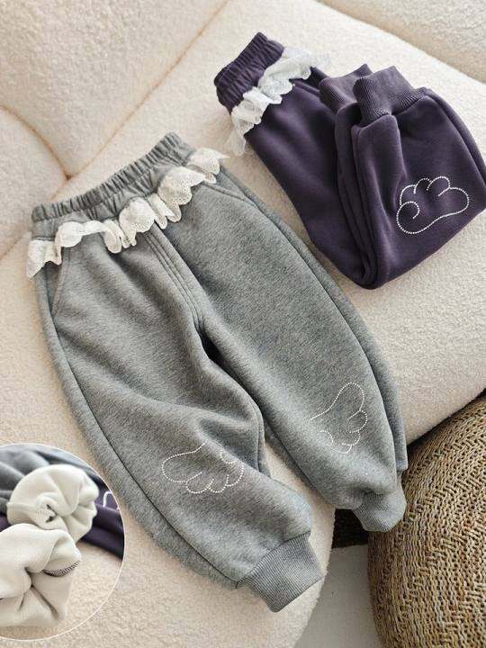 女童可爱加绒卫裤 儿童一体绒花边收口宽松长裤 中小童可开裆冬款