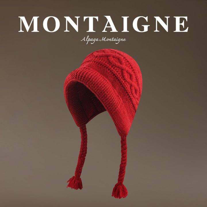 法国Montaigne/蒙田红色大头围护耳帽针织百搭女毛线护耳包头帽子