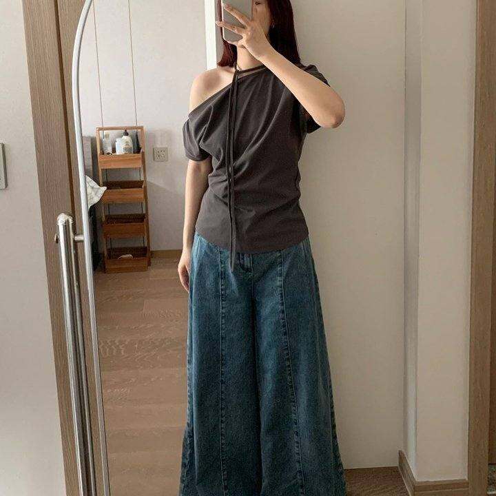 肌理感扭结斜肩小飞袖绑带短袖T恤