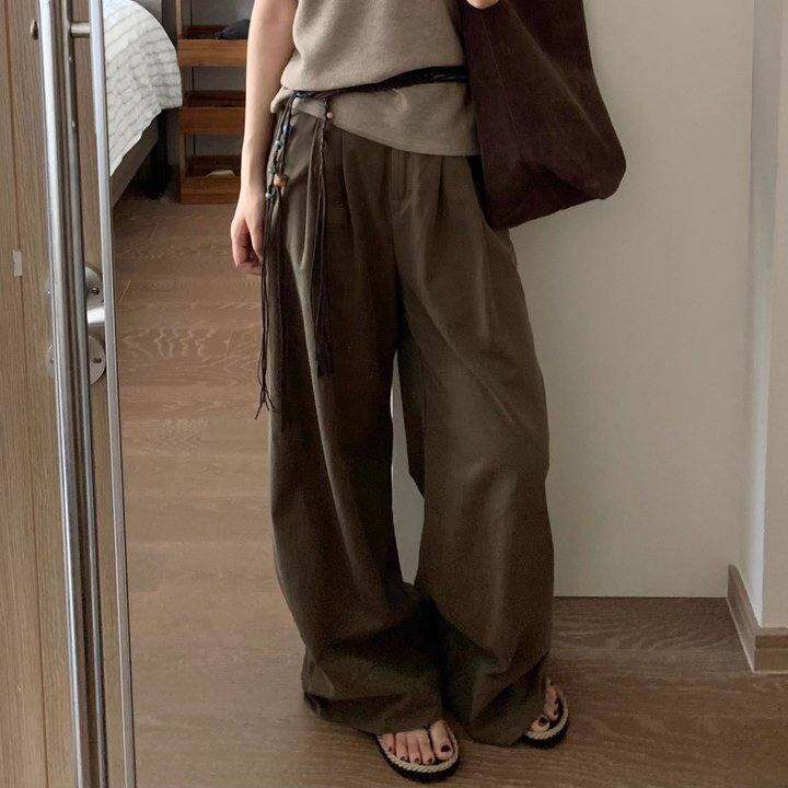 WANZ自制军绿色半松紧高腰宽裤女夏宽松褶皱休闲 𫔮长裤百搭直筒裤