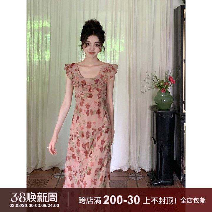 SYT自制款法式浪漫花朵连衣裙女夏季新款收腰显瘦纯欲圆领长裙子1