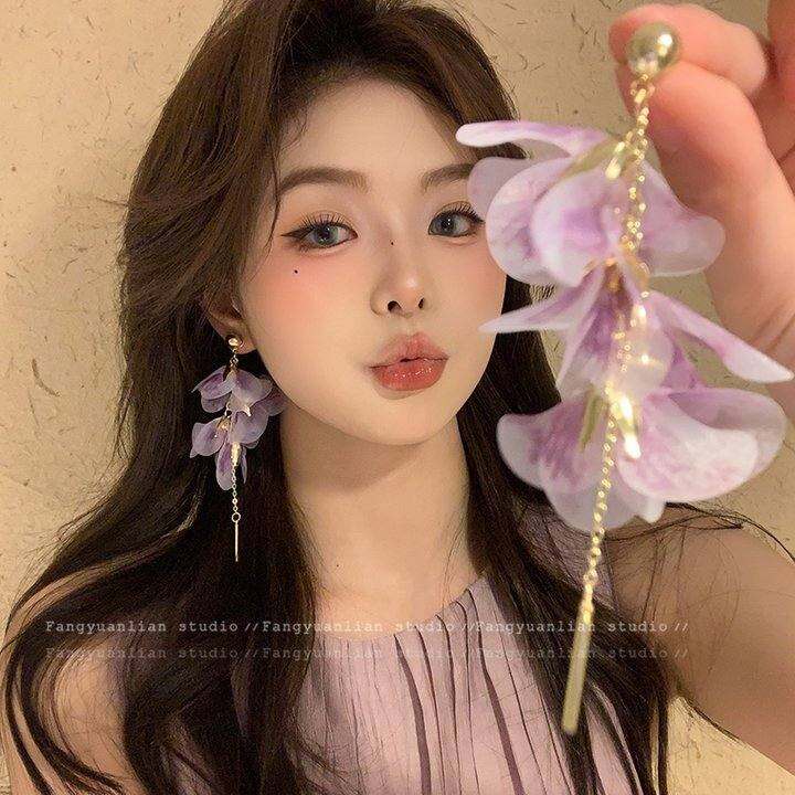 美丽轰鸣 紫色网纱流苏花朵耳环女气质长款耳坠耳钉独特夸张耳饰
