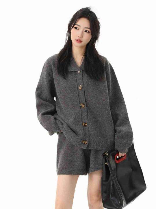 一整套ootd穿搭套装休闲慵懒风灰色翻领针织上衣短裤子两件套25秋