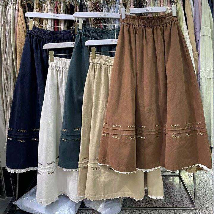 森系高腰花边新款拼接刺绣半身裙新款文艺设计宽松甜美休闲中长裙