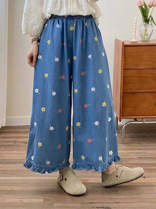 夏款日系小个子花朵印花木耳花边牛仔裤女森系少女覆古文艺阔腿裤