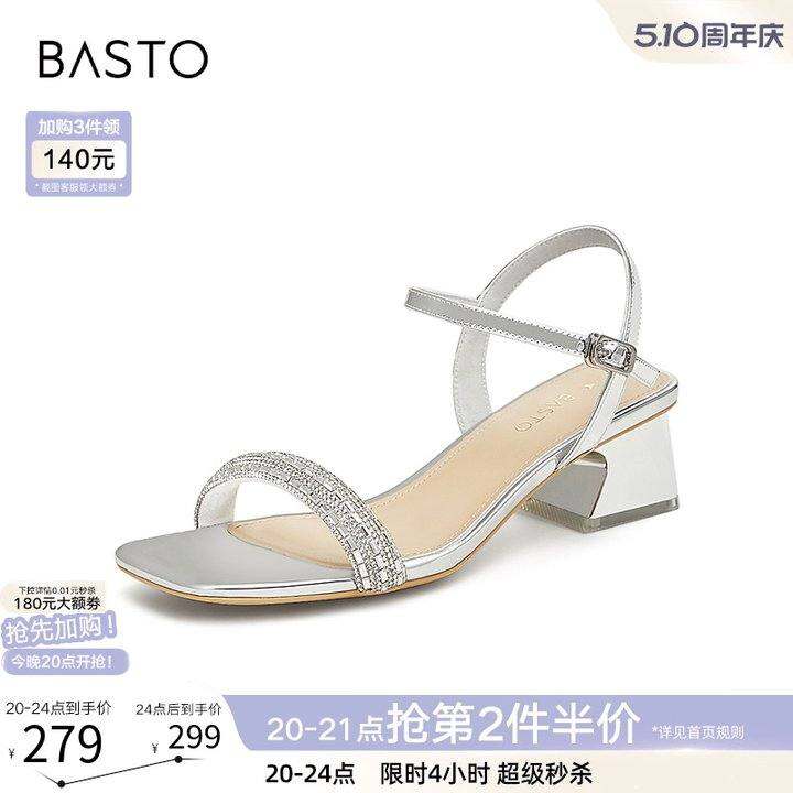 百思图高光鞋夏商场新款气质闪钻粗跟女一字带银色凉鞋TT109BL4