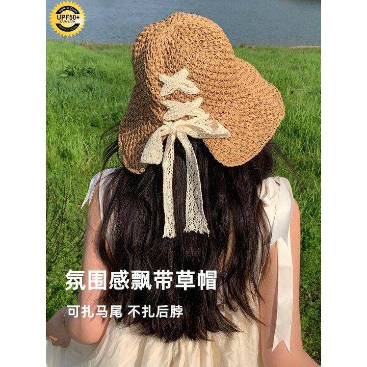 suki yo/赫本风法式草帽女夏季大檐太阳帽遮阳海边度假沙滩防晒帽