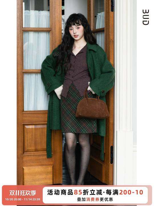 BUD八得 覆古绿色格纹半身裙2025新秋冬高腰修身显瘦百搭a字短裙
