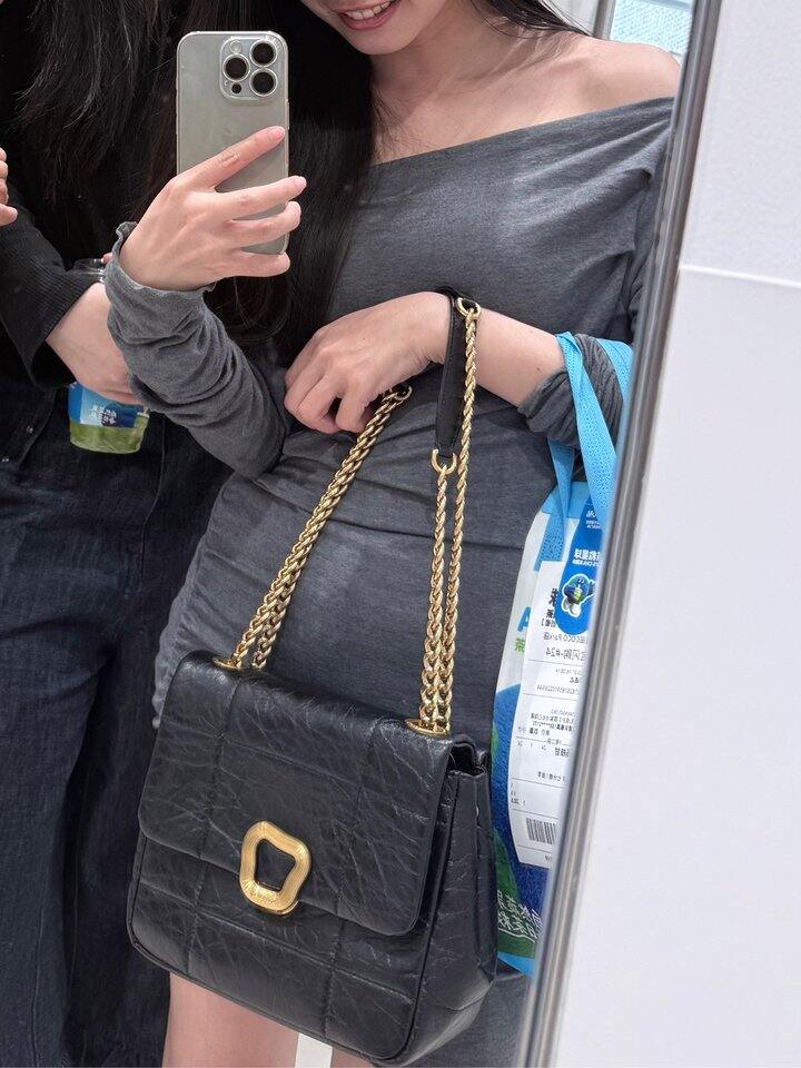 songmont 1月内购时638入的巧克力包中号黑色。黑金配色比较经典。虽说官方说调节链条后有多种背法,但因为我才155,斜挎在我身上有些长。