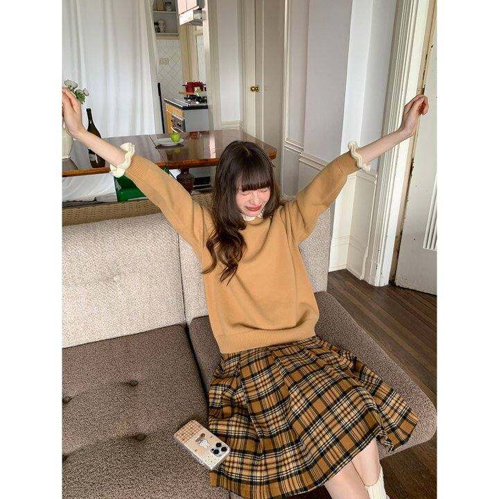 卡农【12/8 00:00 限时9折】落叶大道!复古撞色格纹磨毛百褶半裙