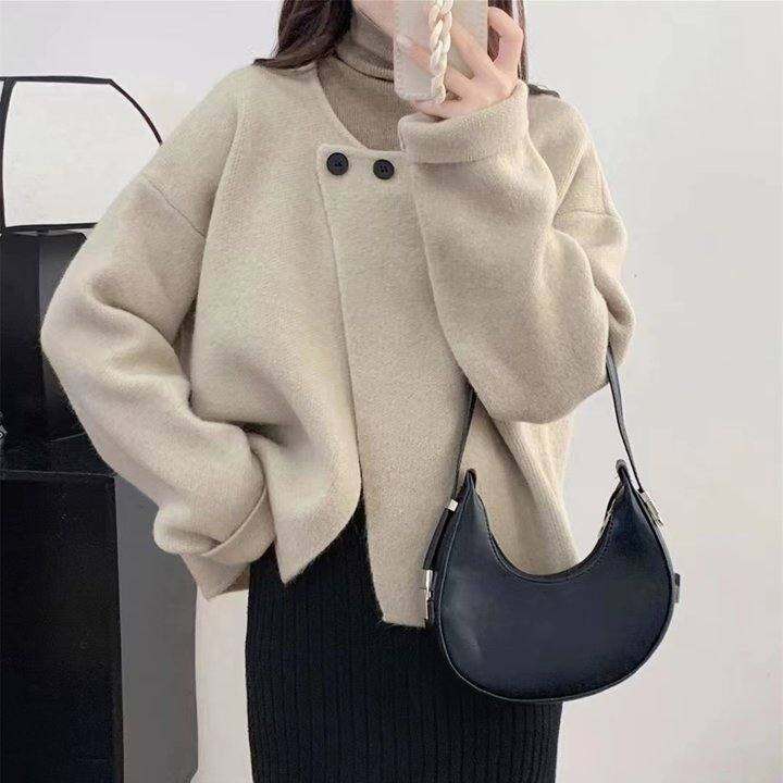 韩版两粒扣设计感纯色针织开衫女秋冬季新款宽松百搭短裤毛衣外套