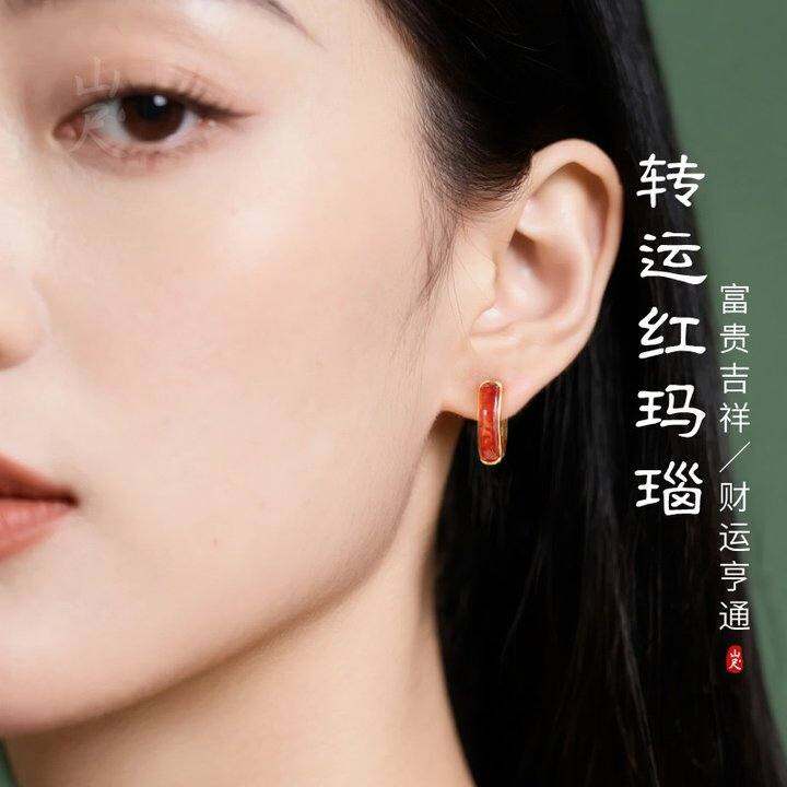 本命年红色耳饰新中式天然红玛瑙耳环纯银复古红宝石耳坠竹节耳扣