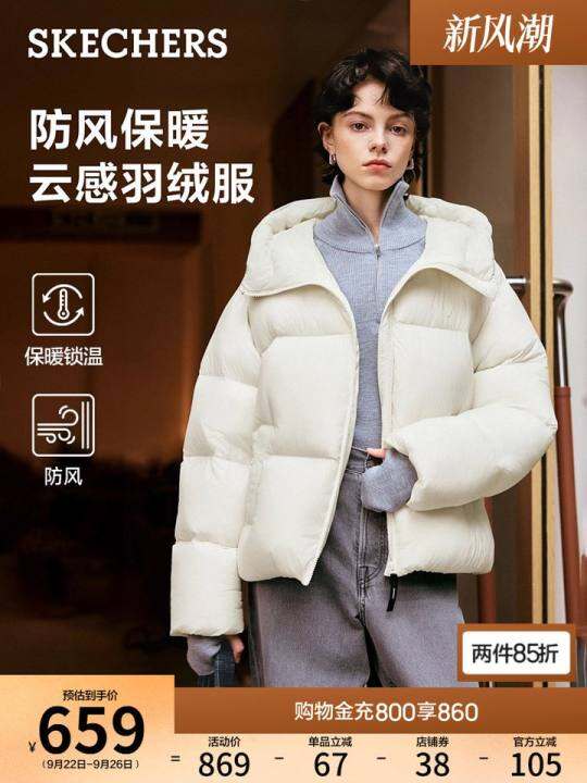 斯凯奇2025秋冬新款羽绒服短款女轻薄防风保暖羽绒外套白色面包服