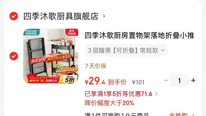 四季沐歌厨房置物架落地折叠小推车3层耀黑【可折叠】常规款