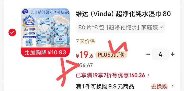 商品右上角直播间领取7折券,4件78维达(Vinda)超净化纯水湿巾80片*8包 家庭囤货湿巾大包湿纸巾