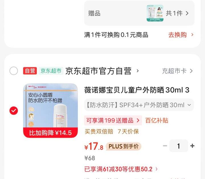 今天凑后17.8 薇诺娜宝贝儿童户外防晒30ml 3岁+小圆盾防晒SPF34