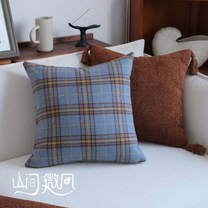 普鲁士蓝抱枕中古风靠枕复古法式美式格子靠包客厅沙发美拉德靠垫