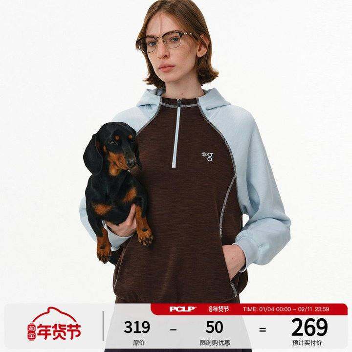 PCLP半拉链撞色插肩连帽运动衫春季新款竹节肌理质感刺绣套头上衣