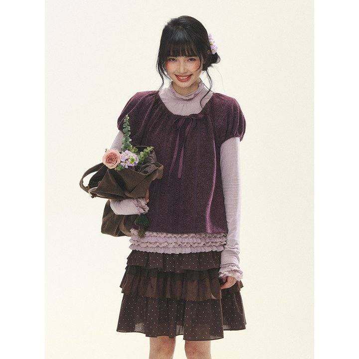 霍里德地图 “葡色手札”蝴蝶结系带蕾丝百搭短袖针织小衫上衣女