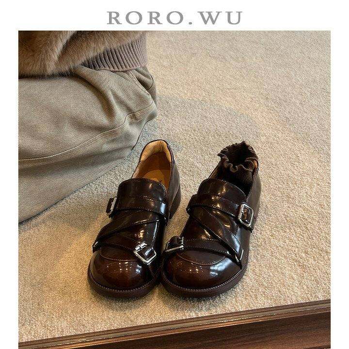 娆娆吴牛皮英伦风小皮鞋圆头皮带扣单鞋春季新款粗跟乐福鞋女K10
