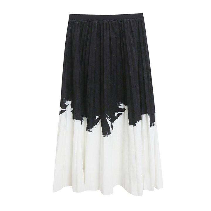 外贸时尚高腰拼色水墨画半身裙气质女士春夏季有内衬百褶裙A字裙