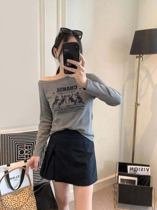 长袖打底衫女t恤2025新款女装韩版时尚早秋穿搭露锁骨一字肩上衣