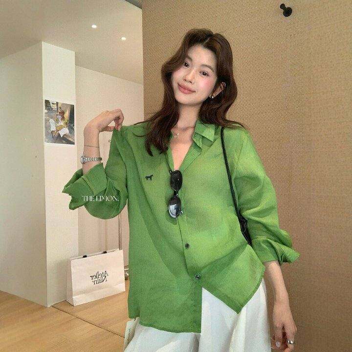 THE LIMON柠檬绿茶简约百搭天丝苎麻小马刺绣单排扣长袖防晒衬衫