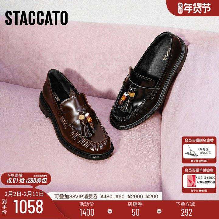 STACCATO2026新款朗姆爵士黑色乐福鞋小皮鞋一脚蹬厚底女鞋9UL06AA6