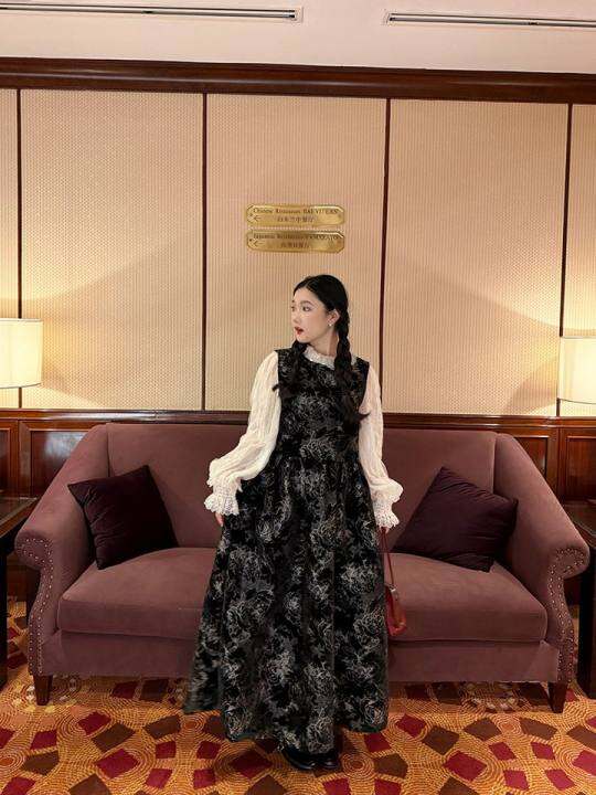 今晚第一单,配灰色打底也好看 裙子是雪尼尔料子 上面花纹是黑金烫上去的 看起来就很贵气hh,大货有一根固定绑带 也会收一点蓬度~ 冬天做内搭也美妙!!