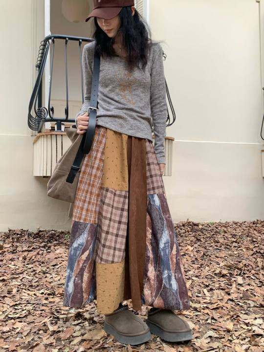 Woven Yonder复古红蓝大格纹日系灯笼收褶棉麻春秋松紧腰半身裙女