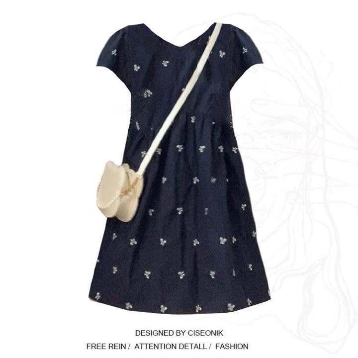 大码胖mm法式蝴蝶结刺绣连衣裙女夏季新款遮肉显瘦设计感甜美短裙