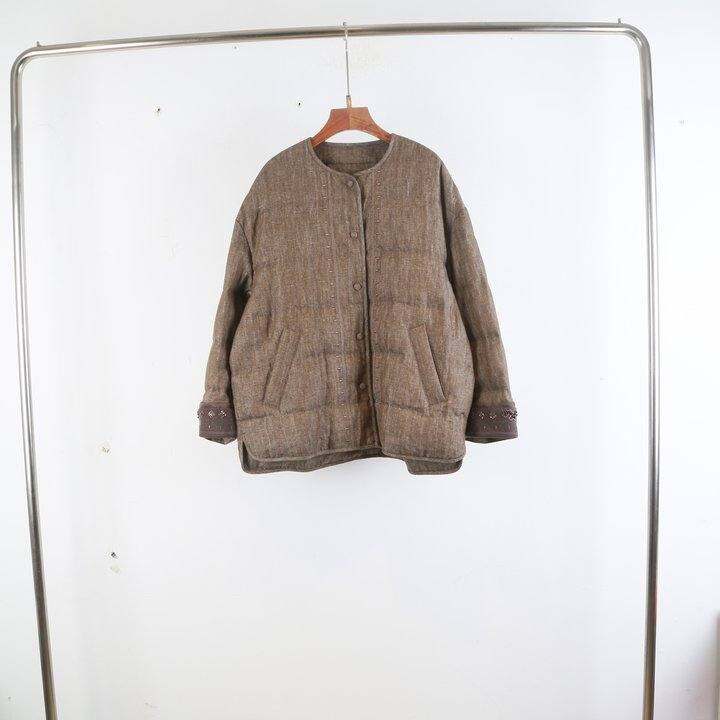 欧洲站2025秋冬女装新款亚麻长袖圆领单排扣宽松鹅绒羽绒服0555