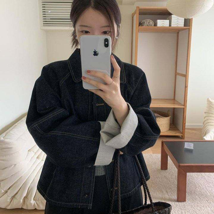 miluroom米鹿牛仔翻领单排扣外套2024年秋季条纹卷边拼接宽松廓形