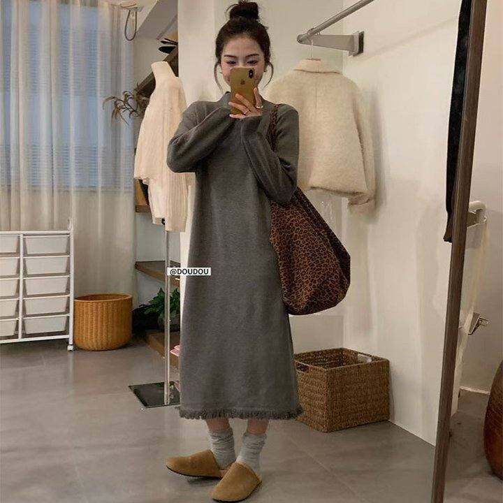 9/20韩代流苏针织连衣裙女秋冬慵懒宽松中长款过膝毛衣裙打底长裙