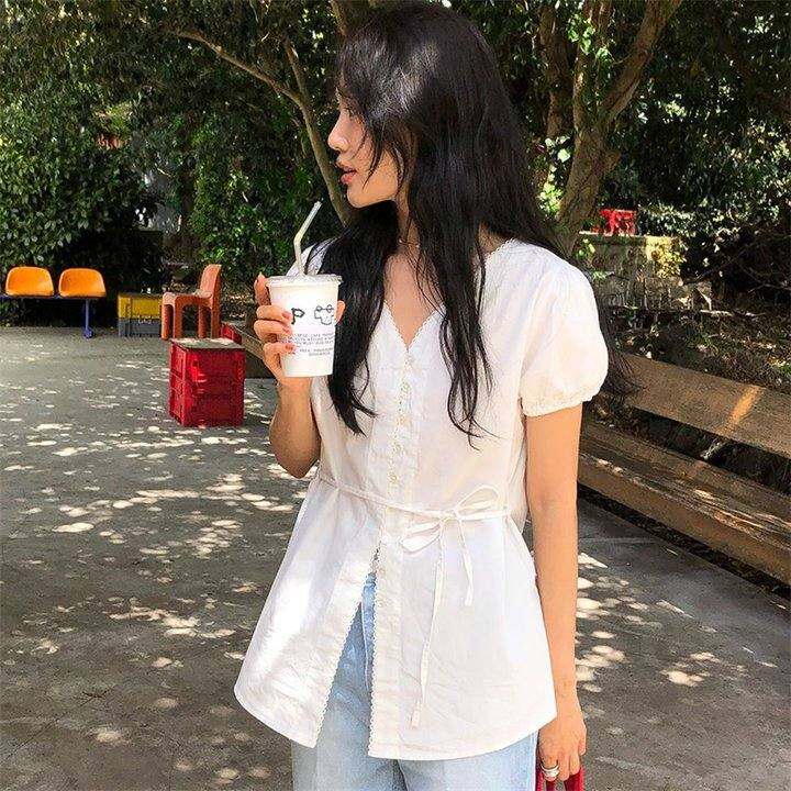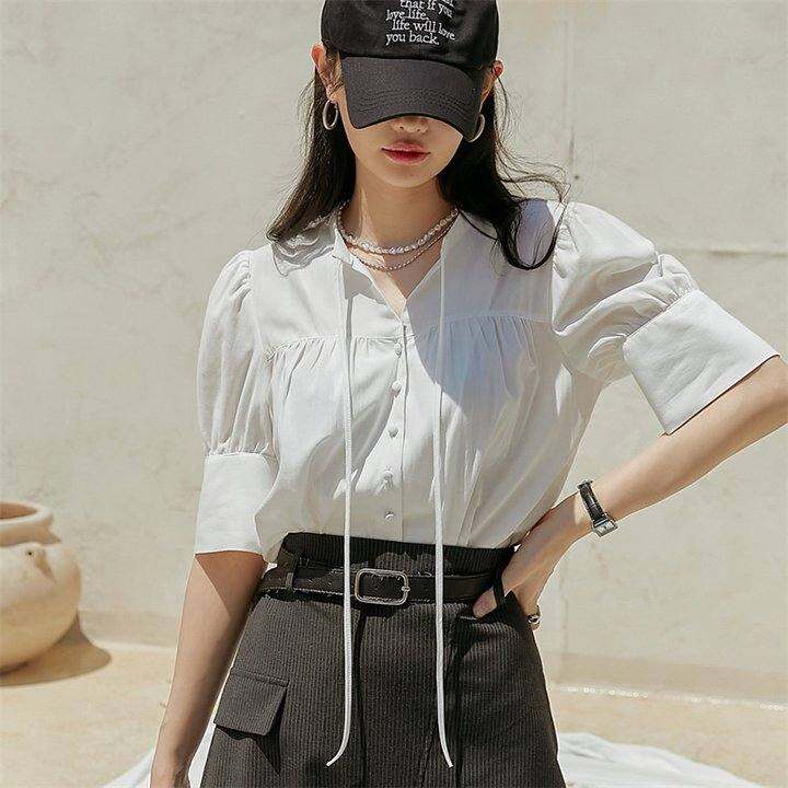 韩国正品 COMMON-UNIQUE官网自制22夏季气质领部系带短款衬衫-bl