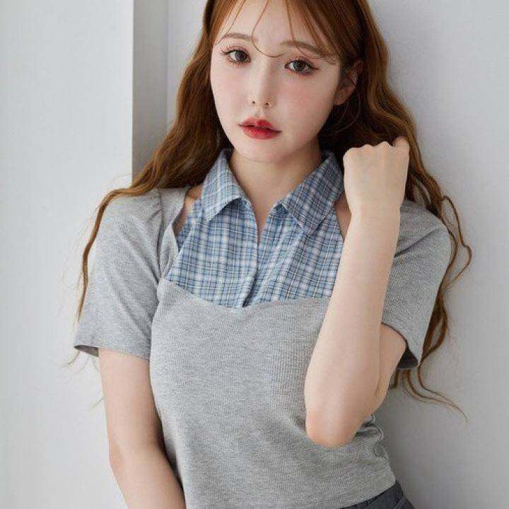 B01075日单NC夏新款客供料V领套头有弹性女甜美拼接假两件短款T恤