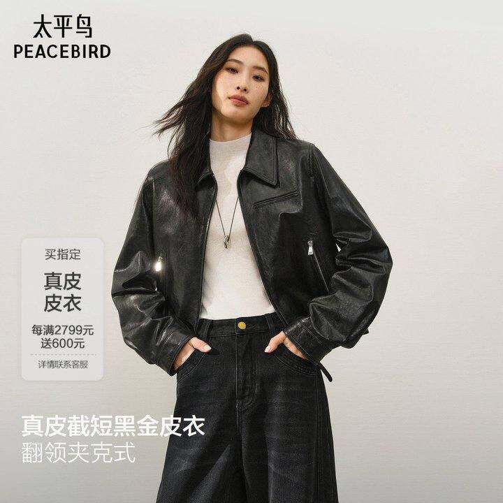 【秀场同款】太平鸟锋姿黑金真皮皮衣25极简廓形外套A1BDF4143*