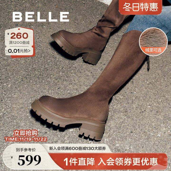 杨天真明星同款百丽女靴子冬季加绒长筒粗高跟厚底高长靴B9U1DDG4