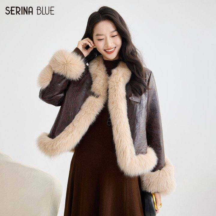 SeRinaBlue商场同款2025年冬季新款90白鹅绒羽绒服女气质皮衣外套
